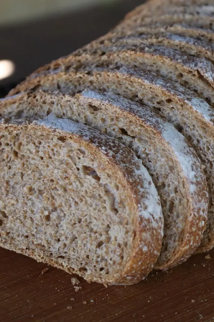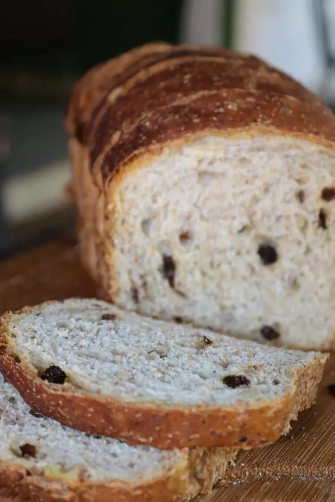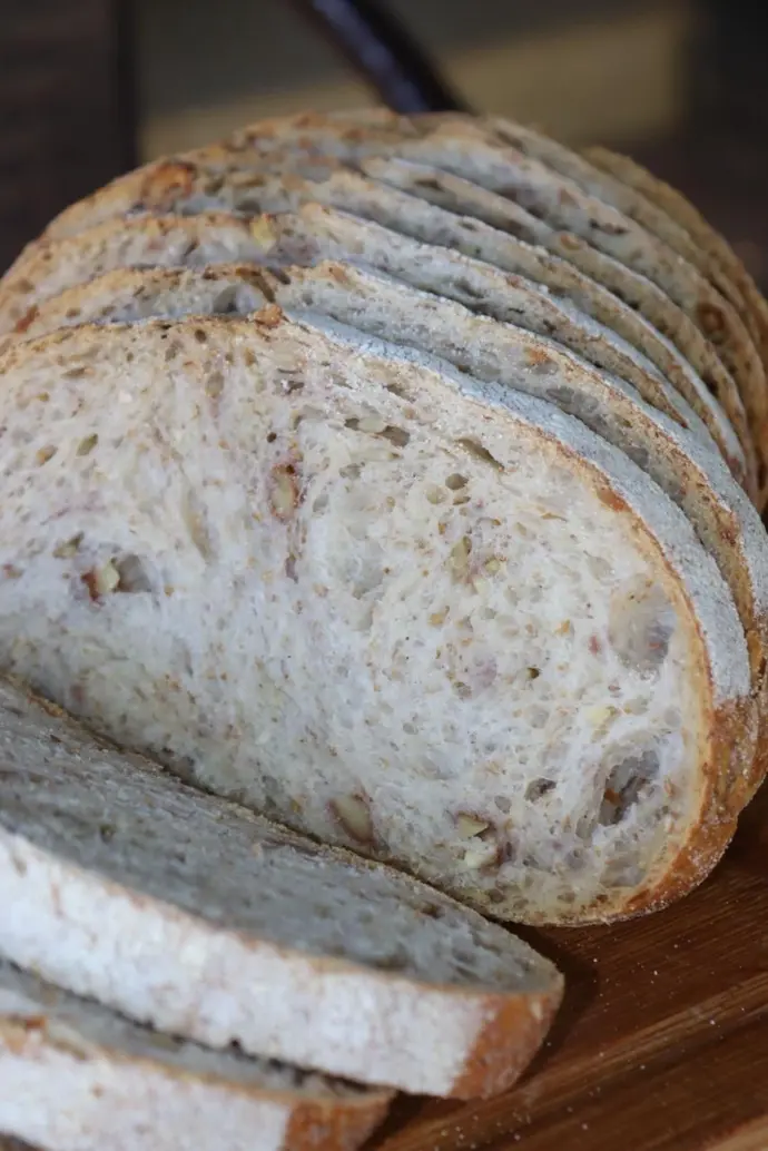 Masa madre, semi-integral, esponjoso con trozos de nuez.